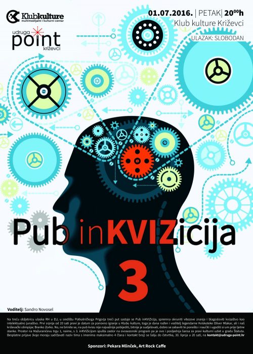 Na treću obljetnicu ulaska RH u EU, u središtu Potkalničkoga Prigorja treći put sastaje se Pub inKVIZicija, spremna okruniti vitezove znanja i blagosloviti kvizaštvo kao intelektualno junaštvo. Prvi srpnja od 20 sati pravi je datum za ponovno igranje u Klubu kulture, toga je dana rođen i voditelj legendarne Kviskoteke Oliver Mlakar, ali i naš križevački olimpijac Branko Zorko. No, ne brinite se, na pub kvizu nije najvažnije pobijediti, bitnije je sudjelovati, dobro se zabaviti te ponešto i naučiti i ugoditi si um prije ljetne stanke. Prostor na Mažuranićevu trgu 1, naime, s 3. inKVIZicijom spušta zastor na ovosezonski program pa je ovo i posljednja šansa za pravi kulturni uzlet u gradu Štatuta. Besplatne prijave, koje moraju sadržavati naziv tima s imenima, maksimalno 4 člana i kontakt broj, šalju se do četvrtka, 30. lipnja u 20 sat.