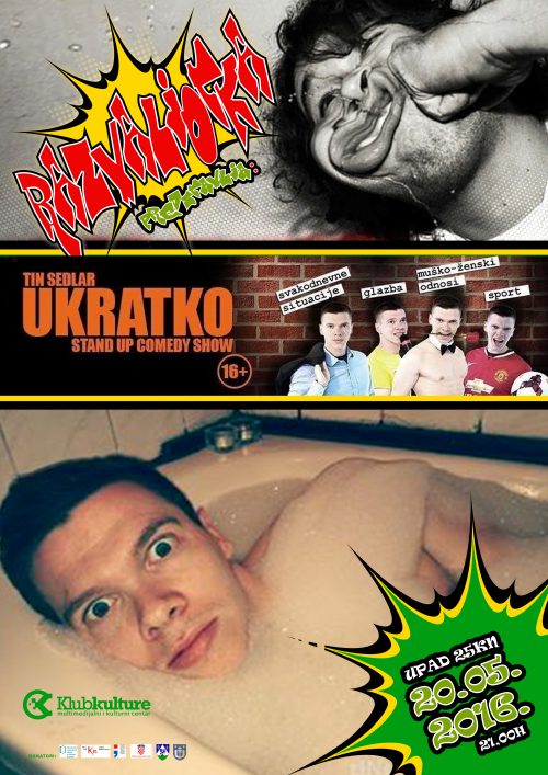 #RAZVALJOTKA # najsmješniji program u Križevcima Petak 20.05.2016.| Klub kulture Križevci | 21:00 UKRATKO by Tin Sedlar Ulazak: 25kuna “Princip je isti, sve su ostalo nijanse…” U 90 minuta programa, Tin izvodi svoje najdraže fore – BEST OF prve 3 godine bavljenja stand up komedijom s kojima se mnogi ljudi mogu poistovjetiti, ali koje izazivaju i čuđenje jer nisu baš normalne. Koji je to sport koji Tinu ide na živce? Kako je to kihnuti i ostati normalan? Koje su to pjesme od kojih poludimo? Zašto ljudi piju da bi se zabavili? Mačke i seks u istoj rečenici? Tin ima odgovore na ova i mnoga druga pitanja. Ukratko, pogledajte kako izgleda svijet iz njegove perspektive i zabavite se – naknadne reklamacije se ne uvažavaju. Ukratko o Tinu: Posudio je stas 7. patuljku u crtiću „Snjeguljica i 7 patuljaka“, boji se svega što je više od 168 cm, voli sve što vole mali. Hobiji su mu nogomet i pokazivanje osobne na ulazu u noćne klubove. Diplomirao je pedagogiju na Filozofskom fakultetu i radi kao pedagog u osnovnoj školi. Poznat je po tome što neugodne situacije može učiniti još neugodnijima i uopće mu zbog toga nije neugodno. Da je žensko, zvao bi se Lea i nosio bi minice i štikle. S obzirom da se ipak rodio kao muško, zove se Tin i nosi štikle. Voli glumiti u predstavama za djecu jer je i sam dijete – unutra i izvana. Stand up ga opušta i ostvaruje mu rijetke želje da nekome govori s visoka.