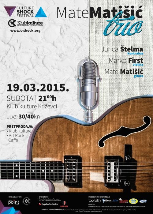 Subota | 19.03.2016. | 21:00 | Klub kulture KONCERT Mate Matišić Trio Ulazak 30/40 kn c-shock.org Jazz poslastica kao i svake godine za najvjerniju publiku. Vrsni majstori, virtuozni glazbenici u sastavu koji čine sjajan gypsy jazzer Mate Matišić, Jurica Štelma na kontrabasu i iznimno cijenjen Marko First na violini, koji prvi put dolazi u Križevce. Mjesta su sjedeća, atmosfera intimna i uhu ugodna, a broj karata ograničen. Uživajte u ponajboljim jazz glazbenicima Hrvatske.