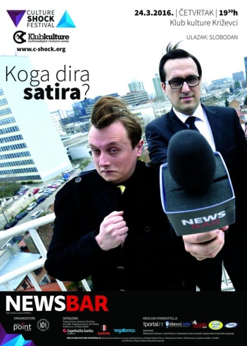 Četvrtak | 24.03.2016. | 19:30 | Klub kulture TRIBINA Koga dira satira? Gosti: Borna Sor, Domagoj Zovak (NewsBar) Moderira: Sandro Novosel Ulazak slobodan www.news-bar.hr Dogodi li vam se da na internetu pročitate vijest toliko nevjerojatnu i nebuloznu da odmah provjeravate odakle je prenesena? Često, kažete? Upravo su ova suluda vremena bogomdana za britku političku satiru i sistematično ismijavanje, u čemu su ljudi iz ekipe satirično-humorističnog portala News Bar jednostavno prvaci! Kakva je hrvatska satirična stvarnost, koga sve dira satira i jesmo li za satiru spremni, samo su neka od pitanja kojih ćemo se dotaknuti u ovoj ozbiljno-zabavnoj raspravi. Kroz bespuća satirične zbiljnosti povest će vas popularni urednički dvojac, a posebno su dobrodošla djeca jugooficira.