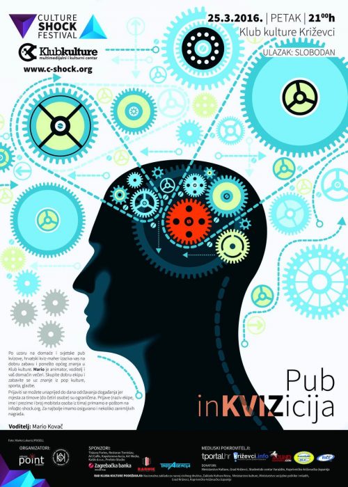 Petak | 25.03.2016. | 21:00 | Klub kulture PERFORMANS Pub inKVIZicija Voditelj: Mario Kovač Ulazak slobodan c-shock.org Po uzoru na domaće i svjetske pub kvizove, hrvatski kviz-maher izaziva vas na dobru zabavu i ponešto općeg znanja u Klub kulture. Mario je animator, voditelj i vaš domaćin večeri. Skupite dobru ekipu i zabavite se uz znanje iz pop kulture, sporta, glazbe. Prijaviti se možete unaprijed do dana održavanja događanja jer mjesta za timove (do četiri osobe) su ograničena. Prijave (naziv ekipe, ime i prezime i broj mobitela osoba iz tima) primamo e-poštom nainfo@c-shock.org. Za najbolje imamo osigurano i nekoliko zanimljivih nagrada.