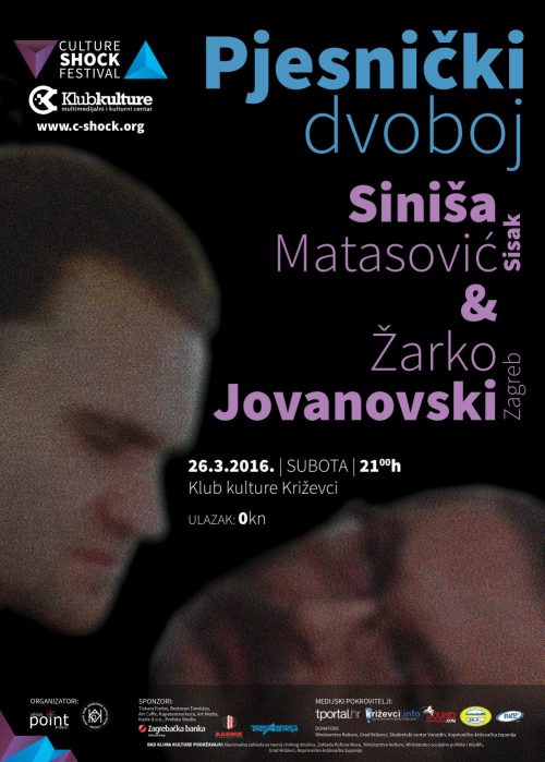 Subota | 26.03.2016. | 21:00 | Klub kulture TRIBINA Pjesnički dvoboj Gosti: Žarko Jovanovski i Siniša Matasović Ulazak slobodan http://zarkojovanovski.blogspot.hr/ http://dhk.hr/clanovi-drustva/detaljnije/sinisa-matasovic Zagrepčanin Žarko Jovanovski, likovni umjetnik, grafički dizajner i frontmen bendova Electric Žare i Abnor Malan, križevačku će publiku, na njemu svojstven način, upoznati s prvim trima knjigama svojega “Petoknjižja” – Hrvatska, Jebo mu pas mater i životu i Besparica, a njegov brat po peru, Siščanin Siniša Matasović, član Društva hrvatskih književnika, razbudit će nas izborom iz svoje zbirke poezije “Sisak se uspješno pretvara da spava”. Obojica su nagrađivani slam pjesnici, ali ako i kada zatreba, smrtno su ozbiljni. Ili nisu.