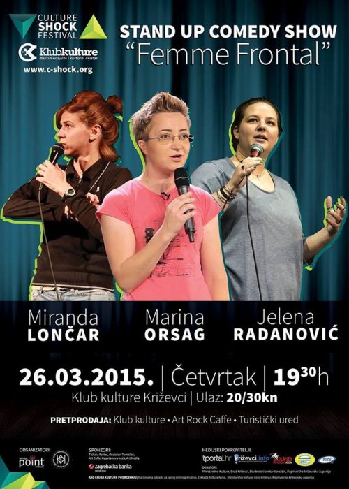Četvrtak 26.03. | Klub kulture Križevci | 19:30 PREDSTAVA FEMME FRONTAL: Jelena Radanović (SRB), Miranda Lončar (BIH), Marina Orsag (HRV) Ulaz 20/30 kuna studiosmijeha.hr Tematski stand up “Femme Frontal” projekt je stand up komičarki Marine Orsag, Mirande Lončar te Jelene Radanović koje su, nakon višegodišnjeg zajedničkog rada i redovitog slušanja da se nalaze u muškom poslu i da to nije za njih, odlučile udružiti snage, uzeti mikrofon u ruke i dokazati svima na ovoj regionalnoj turneji da mogu svojim humorom i više nego parirati bilo kojem kolegi. A kad već dolaze iz raznih država bivše Jugoslavije, poradit će malo i na senzibilizaciji međususjedskih odnosa. Od nedavno su ove tri žene i Ambasadorice WWF Adria za 2015. godinu, pa će samim time promovirati i Earth Hour. KARTE SU U PRODAJI! Art Rock Caffe, Klub kulture, Turistička zajednica