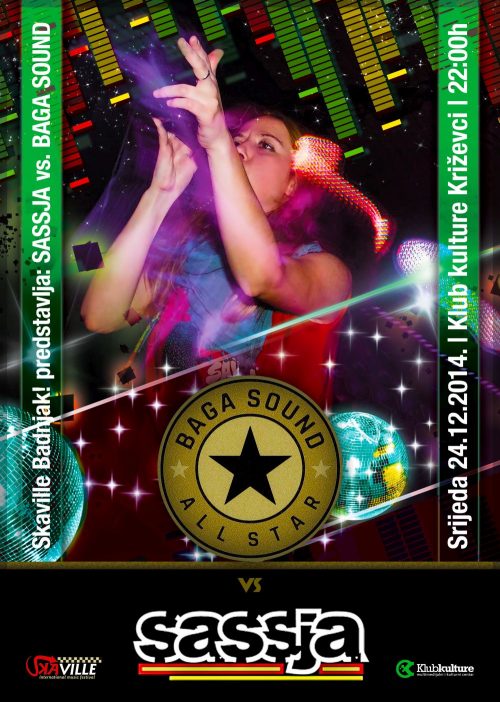 Srijeda 24.12.2014. | Klub kulture Križevci | 22:00h Skaville Badnjak! predstavlja: SASSJA vs. BAGA SOUND Ulaz: besplatan Kakav bi to bio Badnjak u Križevcima da ne dolazi Baga Sound? Tradiciju ne vrijedi prekidati već samo čuvati. A mi čuvamo Badnjak samo za Bagavce, za best of selekciju na kraju godine kad se hitovi stavljaju na hrpu. Roots, reggae, jungle, dancehall, Jamajka u malom! Ovoga puta imamo specijalnu gošću jer dolazi nam i Sassja-Žena FM JAM-a! Sassja uskoro izdaje album za Menart, spoj hiphopa, reggae, rub a dub ritmova. Sassja je već poznati MC u regiji i youtube klikovi samo se vrte, njena stvar Clash postala je trenutni hit. Vidimo se u Klub Kulture uz besplatan ulaz. Što da vam kažemo, pozivamo sve na jedan od najluđih partija godine.