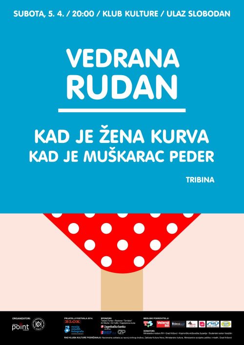 Subota | 5.4.2014. | 20:00 | Klub kulture TRIBINA Kad je žena kurva / kad je muškarac peder Gošća: Vedrana Rudan Višestruko prevođena hrvatska književnica, kolumnistica i kontroverzna blogerica uvijek je spremna podsjetiti nas da stvari nisu ni izbliza onoliko jednostavne koliko bi možda netko volio vjerovati i da se na kraju svake potrage za smislom krije tek po jedno kozmičko razočaranje. Stoga, ne dopustite da vas prevare! Dođite na književnu tribinu i osjetite oštrinu poput smrtonosnog štektanja strojnice, a ujedno i blagost istinski moralističke spisateljice koju najviše vole mrziti! Ulaz slobodan www.rudan.info