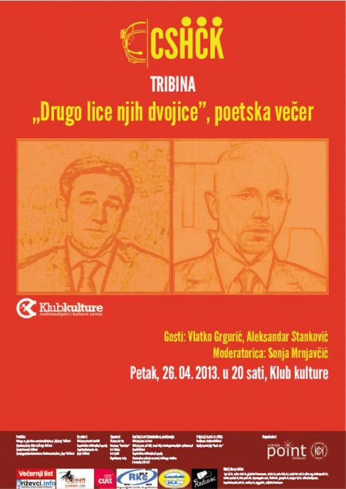 Petak | 26.4.2013. | 20:00 | Klub kulture TRIBINA „Drugo lice njih dvojice”, poetska večer Gosti: Vlatko Grgurić (Plodovi zemlje), Aleksandar Stanković (Nedjeljom u 2) Moderatorica: Sonja Mrnjavčić Ne, ne, nije to u nedjelju i ne gledate TV! Ova poznata televizijska lica imaju svoju manje poznatu, poetsku stranu koju su nesebično odlučili podijeliti s nama! Malo je poznato da je Grgurić nagrađivani pjesnik i najmlađi dobitnik nagrade Goranovog proljeća, izdao je nekoliko zbirki pjesama, a Stanković je sa svojom pjesmaricom podigao dosta prašine. Šeretski blagoglagoljivi dvojac britko i glatko sipa stihove i krajnje je vrijeme da ih i mi čujemo! Ulaz slobodan www.hrt.hr