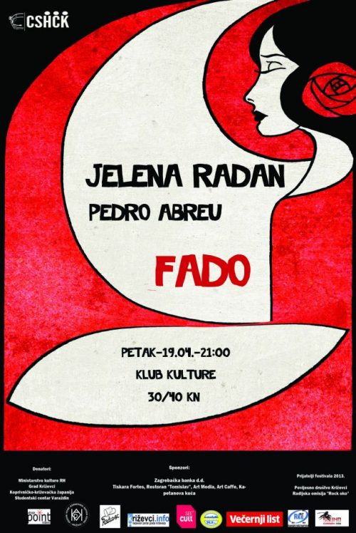 Petak | 19.4.2013. | 21:00 | Klub kulture KONCERT „Fado” Jelena Radan i Pedro Abreu Ova uvijek posebna i izuzetno zanimljiva hrvatska glazbenica vraća se u Križevce samo tri mjeseca nakon što je održala humanitarni koncert “Petaka za đaka/FIVE4KIDS”, ovog puta s pjesmama koje pričaju priču o fadu, Amaliji Rodrigues i portugalskom narodu te vode publiku na putovanje sudbine i volje, mora i vjetra, straha i čežnje… U pjevanju fada prati je gitarist s portugalskog otoka Madeire i, nešto manje poznato, križevački zet. Ulaz 30/40kn www.jelenaradan.hr