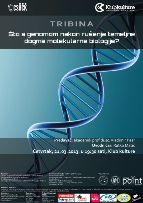 Četvrtak | 21.3.2013. | 19:30 | Klub kulture TRIBINA „Što s genomom nakon rušenja temeljne dogme molekularne biologije?” Predavač: akademik prof.dr.sc. Vladimir Paar Uvodničar: Ratko Matić Ime fizičara i akademika Vladimir Paara godinama je u očima hrvatske javnosti bilo simbolom protivljenja teorijama o globalnom zatopljenju. No, njegova je glavna znanstvena preokupacija u posljednje vrijeme istraživanje genoma, odnosno genomskih regulatora. Saznajte što je akademik Paar otkrio novog na ovom području i koje se znanstvene dogme sprema srušiti svojim otkrićima. Ulaz slobodan info.hazu.hr/vladimir_paar