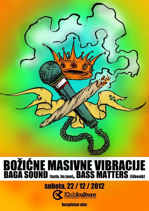 22.12.2012. | Klub kulture Križevci | 21,00h BOŽIĆNE MASIVNE VIBRACIJE: Baga Sound (Tuzla, FmJam) Bass Matters (Šibenik) Ulaz: besplatan Treću godinu zaredom božićne dane u klubu proslaviti ćemo uz Baga Sound, reggae ogranak FmJam ekipe. Baga je izgradila kultan status u Križevcima zahvaljujući vrhunskoj selekciji i plesnim tulumima do zore uz reggae, jungle i dubstep. Ovog puta imamo i goste iz Šibenika, tj. Bass Matters ekipu koja je od jednog događaja izrasla u soundsystem koji obožava dub i roots. Jedna vruća božićna noć puna bass ritmova svih žanrova. A ulaz je besplatan i dalje! Jednostavno klasik od partija!