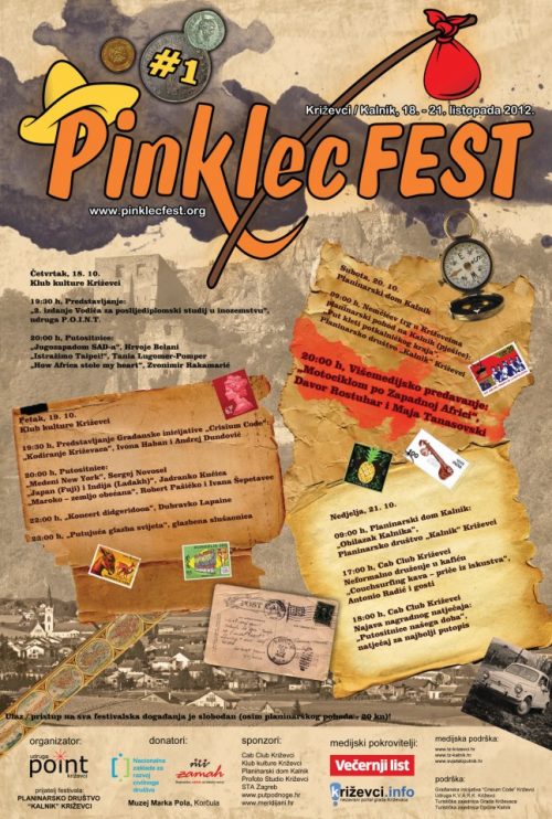 Od četvrtka do nedjelje posjetite 1. Pinklecfest – novi avanturistički festival u Križevcima! U Križevcima, povijesno poznatom križištu puteva, od 18. listopada 2012. održava se Pinklecfest, inspirativni festival o putovanjima, avanturizmu i turizmu, traganju i migraciji, odlasku i dolasku, skitnjama i lutanjima te ponovnom povratku. Po uzoru na Hrvatski putnički festival (Croatian Travel Festival), čije je prvo izdanje održano ove godine od 11. do 13. svibnja u Šibeniku, križevačka udruga P.O.I.N.T. je u suradnji s Planinarskim društvom “Kalnik” Križevci ovaj novi kulturno-avanturistički festival posvećen putovanjima odlučila pokrenuti u jesenskom periodu, kako bi u središnjem dijelu Hrvatske okupio zaljubljenike svih uzrasta u vožnje, letove, plovidbe i pješačenja te postao mjestom njihovog zajedničkog druženja, razmjene iskustava i zabave. Pinklec je riječ iz kajkavskog narječja, uobičajena u Kalničkom Prigorju, a predstavlja naramak, naprtnjaču, zavežljaj onih stvari najpotrebnijih čovjeku pri odlasku na put, tradicionalno u potrazi za poslom. U novije doba simbolom je lutanja i vrludanja, bezbrižnosti, ali i minimalizma, nerastrošnosti pri otkrivanju novih mjesta te istinskog, nekonzumerističkog doživljaja putovanja. PROGRAM: 1. Četvrtak, 18. listopada, Klub kulture Križevci (Mažuranićev trg 1), od 19.30h 2. Petak, 19. listopada, Klub kulture Križevci (Mažuranićev trg 1), od 19:30h 3. Subota, 20. listopada, Planinarski dom Kalnik (Starogradska 64), od 20:00h 4. Nedjelja, 21. listopada, Cab Club Križevci (Petra Zrinskog 2), od 17:00h