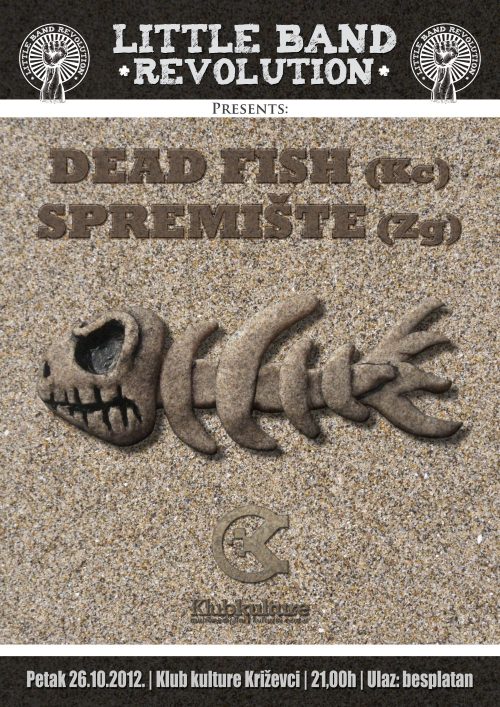 Petak 26.10.2012. | Klub kulture Križevci | 21,00h Little Band Revolution: DEAD FISH (Kc) SPREMIŠTE (Zg) Ulaz: besplatan Predstavljamo nove „male“ bendove koji traže vašu pažnju. Dead Fish iz susjedne Koprivnice kombiniraju hip hop i drum’n’bass pa zvuče kao hrvatska inačica Penduluma sa gitarama. Spremište iz Zagreba sa svojom pop ska rock i reggae kombinacijom vjerojatno prepoznajete po hit reklami za Karlovačko jer upravo njihova Bananana svira u pozadini. Dva odlična benda koje možete pogledati besplatno nude zanimljiv presjek stilova koji definitivno tvore budućnost HR scene.