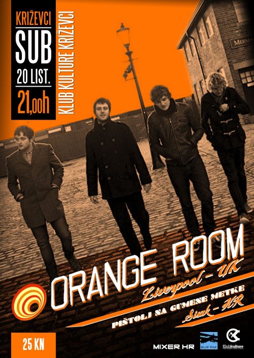 Subota 20.10.2012. | Klub kulture Križevci | 21,00h Blue Pilot & Mixer.hr predstavljaju: ORANGE ROOM (Liverpool, UK) PIŠTOLJ NA GUMENE METKE (Si) Ulaz: 25 kuna Blue Pilot (UK) i Mixer.hr predstavljaju Orange Room iz Liverpoola. Fantastičan indie rock bend nastao u Australiji gdje je osvajao top liste i punio klubove preselio se u Veliku Britaniju, točnije u Liverpool kako bi kvalitetom došao do šire europske publike. Četvorka puna energije na tragu Oasisa, Artic Monkeysa, Beatlesa i sličnih bendova donosi dašak moderne britanske rock produkcije i u Križevce. Domaća podrška rezervirana je za odličan hr bend Pištolj na gumene metke iz Siska. Energičnost, jednostavnost i iskrene poruke uz rock’n’roll trzaje gitara i tekstove na hrvatskom jeziku čine ovaj bend novom nadom HR rock scene. Vrhunski koncert na koji vas pozivamo sa zadovoljstvom.