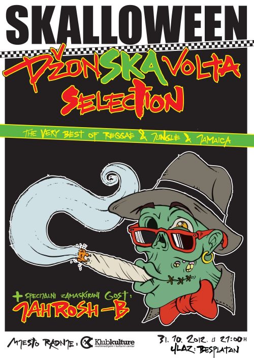 Srijeda 31.10.2012. | Klub kulture Križevci | 21,00h Skaville Skalloween Party: DzonSkaVolta selekcija! + JahRosh-B specijalni zamaskirani gost! Ulaz: besplatan Da li je Halloween samo komercijalna izmišljotina ili ima povijesni značaj koji su prihvatile mnoge europske zemlje? Poganski običaj koji treba odbaciti? Guglajte i čitajte i razvijajte svoje mišljenje jer internet će biti pun razglabanja na tu temu. A mi ćemo svejedno napraviti dobru i kreativnu žurku. I nazvat ćemo je Skalloween jer u prvi plan dolaze jamajkanski ska, reggae i rocksteady ritmovi. A poslije ponoći možemo prebaciti težište malo na dancehall, hip hop i jungle. Možda ponešto drum’n’bassa i dubstepa. Nudimo i nagrade. Za najzastrašujuće maske, kostime ili izrezbarene bundeve. Ulaz je besplatan a od vas tražimo dobru volju i kreativnost:)PS. u ponoć biramo pobjednike, tj. izabrati će ga publika:) Nagrade su par poklon bonova na šanku, 10 besplatnih upada na godišnjicu kluba, godina dana besplatnog upada na sva događanja i slično. Zamaskirajte se!! 😀