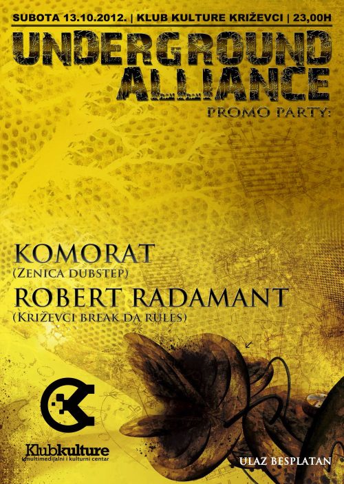 Subota 13.10.2012. | Klub kulture Križevci | 23,00h Underground Alliance promo party: KOMORAT (Zenica dubstep) ROBERT RADAMANT (Križevci break da rules) Ulaz: besplatan Underground Alliance je glazbeni projekt i label mase odličnih producenata elektronske glazbe . U Križevcima ćemo ugostiti Komorata iz Zenice. Osnivač i urednik BH Dubstep sajta koji prati dešavanja na regionalnoj dubstep sceni. Njegovi setovi su bazirani na londonskom i bristolskom underground zvuku sa osjetnim dub/reggae elementima. Robert Radamant vozi svoj breakbeat i glitch hop stil te kao pravi domaćin pruža podršku najboljim breaks –bass izvođačima. Ulaz je besplatan.
