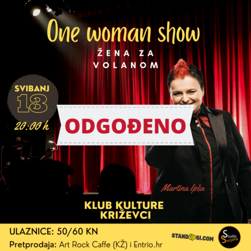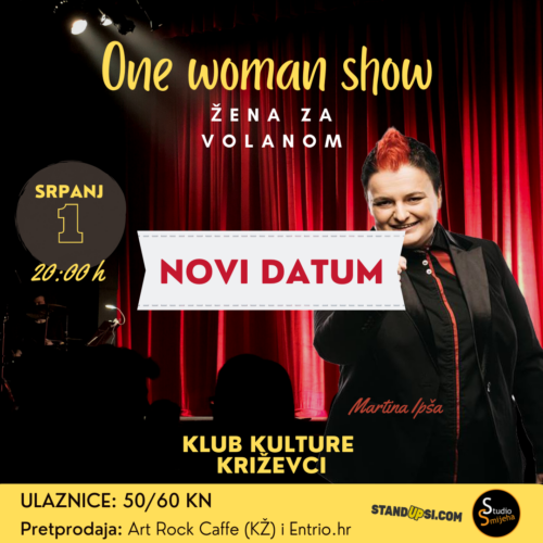 𝗢𝗻𝗲 𝗪𝗼𝗺𝗮𝗻 𝗦𝗵𝗼𝘄: 𝗠𝗮𝗿𝘁𝗶𝗻𝗮 𝗜𝗽𝘀̌𝗮 “𝗭̌𝗲𝗻𝗮 𝘇𝗮 𝘃𝗼𝗹𝗮𝗻𝗼𝗺” | 𝘀𝘁𝗮𝗻𝗱 𝘂𝗽 𝗸𝗼𝗺𝗲𝗱𝗶𝗷𝗮 | 𝗽𝗲𝘁𝗮𝗸, 𝟭.𝟳.𝟮𝟬𝟮𝟮. | 𝗞𝗹𝘂𝗯 𝗸𝘂𝗹𝘁𝘂𝗿𝗲 | 𝟮𝟬:𝟬𝟬 𝗵 | 𝗨𝗹𝗮𝘇: 𝟱𝟬/𝟲𝟬 𝗸𝗻 Nakon odgođenog termina (13.5.2022.) novi datum za One Woman Show: Martina Ipša “Žena za volanom” je petak, 1.7.2022.. ***VAŽNE INFORMACIJE*** Sve kupljene ulaznice važeće su i za novi datum. Ukoliko Vam novi datum ne odgovara, povrat novca za kupljene ulaznice u Art Rock Caffeu možete zatražiti svakim radnim danom od 8:00 do 16:00 h pozivom na broj telefona 048/711-073 ili slanjem e-maila na kontakt@klubkulture.org. Za sve one koji su ulaznice kupili online putem Entrio platforme, povrat je potrebno zatražiti isključivo preko web forme https://www.entrio.hr/refund najkasnije do 20.5.2022. Martina Ipša jedna je od začetnica stand up komedije u Sloveniji i jedna od najboljih slovenskih stand up komičarki. Žena koja je oduševila prepunu Koncertnu dvoranu Vatroslava Lisinskog, oduševiti će i vas. ‘Ko je nije gledao, takvu grešku ne ponavlja nakon što čuje kako je bilo odlično. Njezin nastup, pun originalnosti i direktnosti, popularan je kod publike različitih profila. U 17 godina karijere nastupala je u više država i osim na slovenskom, nastupa i na engleskom te hrvatskom jeziku. Ne samo da se bavi stand up komedijom, nego piše i komedije za kazalište, kreirala je emisije za televiziju i redovni je gost slovenskih televizija. Sa kolegama iz regije i uz organizaciju Standup.rs nastupala je u emisiji Stand up & More, koja je bila emitirana na Comedy central Extra. Prije par godina proglašena je za Europskog heroja humora. Godine 2018. sa svojim showom rasprodala je i Klub kulture, a ponovo nam stiže na petak 13. sa svojim najboljim, najudarnijim i naravno najsmješnijim forama te planira odgovoriti na mnoga pitanja poput: Kakav je odnos između Slovenije i Hrvatske? Kako razmišljaju žene? Kako izdržati dugo u vezi? Kako je moguće da je netko sa 2x idealne težine tako seksi? I naravno, najstarije pitanje svih vremena: Može li netko iz Slovenije biti smiješan? ULAZ: 50/60 kn Pretprodaja: Art Rock Caffe Križevci i Entrio.hr (online)