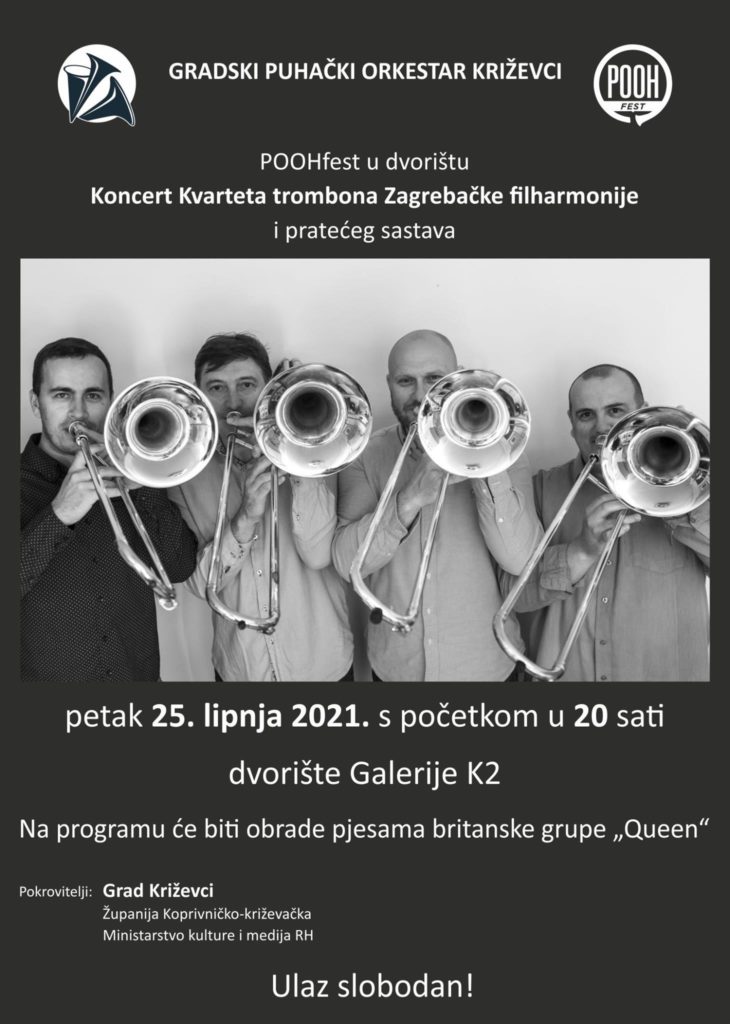 15. festival POOHfest gostuje u dvorištu Galerije K2 gdje će nastupiti kvartet trombona Zagrebačke filharmonije. Uz pratnju banda, kvartet izvodi repertoar britanske grupe Queen! Ulaz je slobodan!