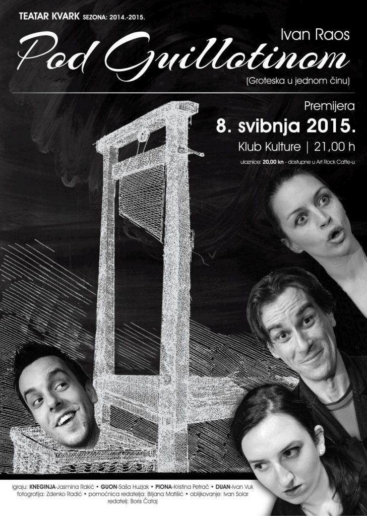 Povodom 15 godina djelovanja udruge K.V.A.R.K. predstavljamo vam predstavu Ivana Raosa “Pod Guillotionom” – grotesku u jednom činu križevačkog redatelja Borisa Čataja, osnivača i voditelja Teatra KVARK. Ulaznice po cijeni od 20 kuna možete kupiti isključivo u Art Rock Caffeu.